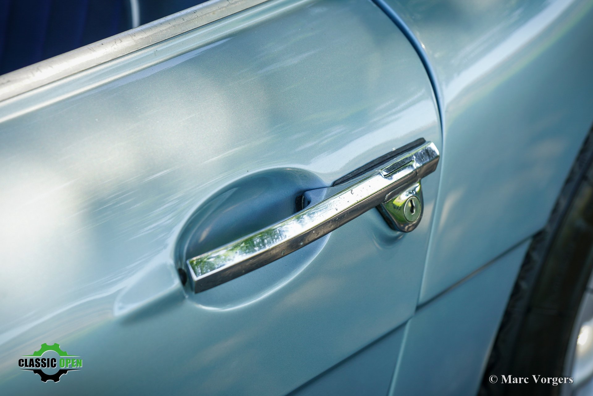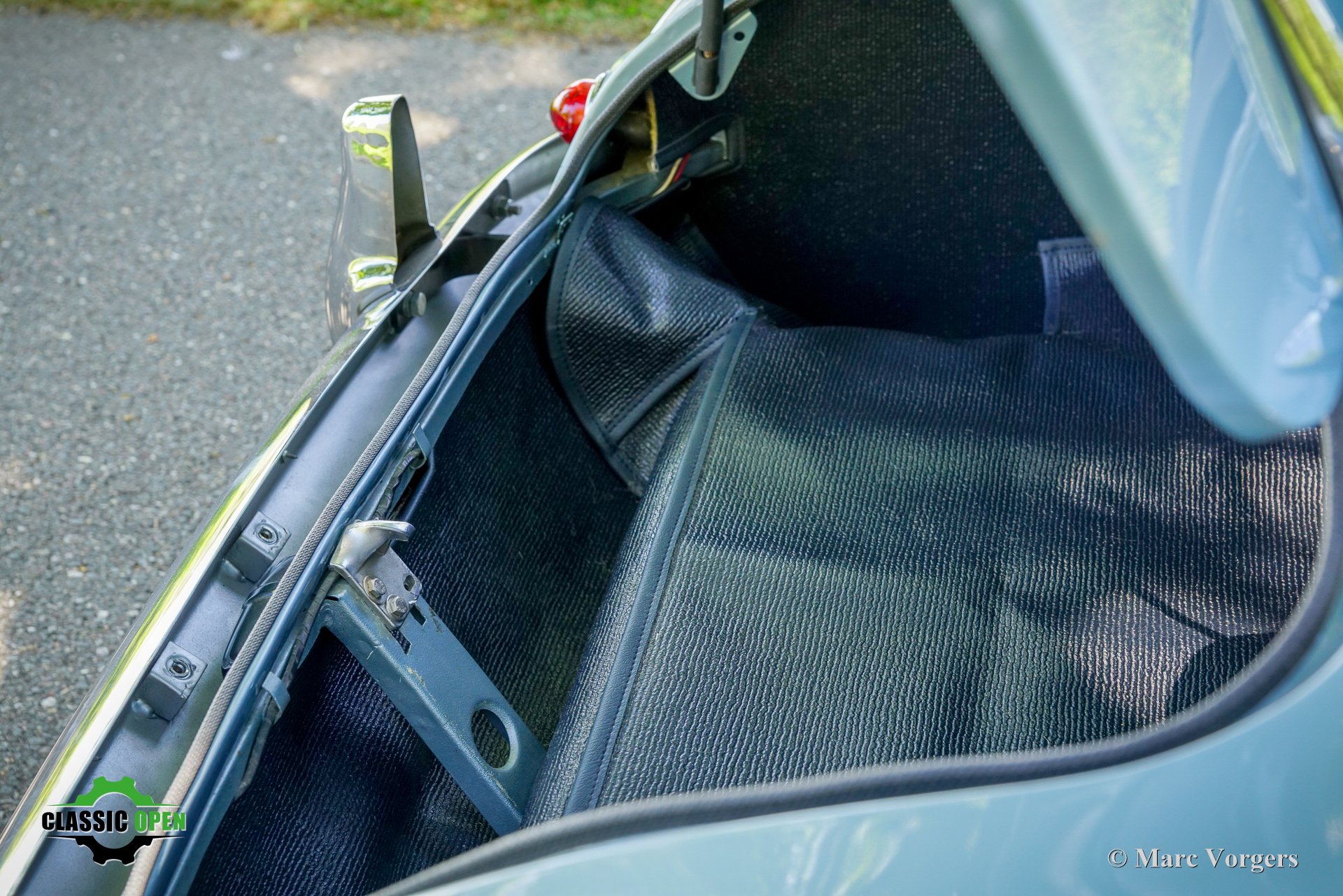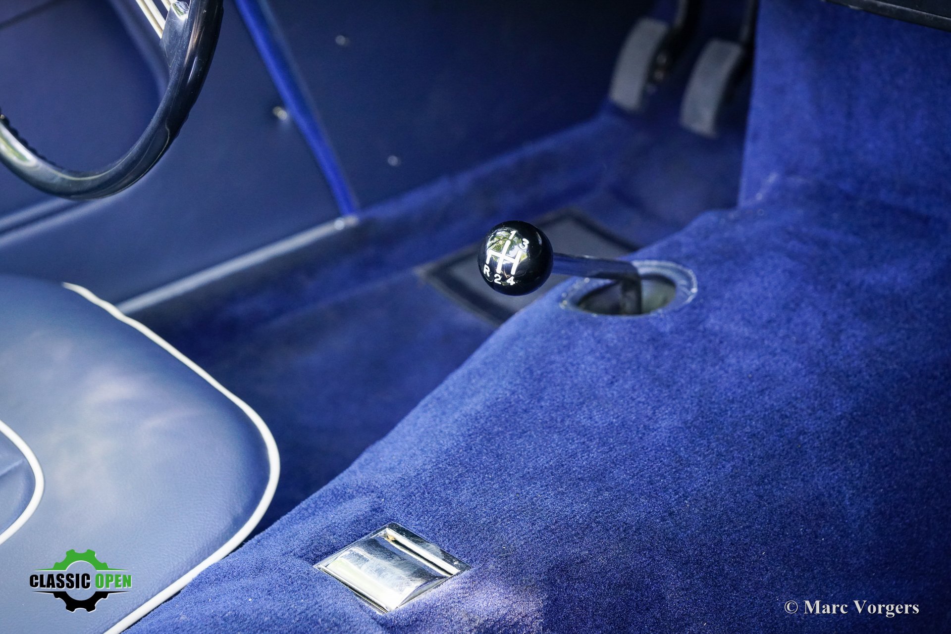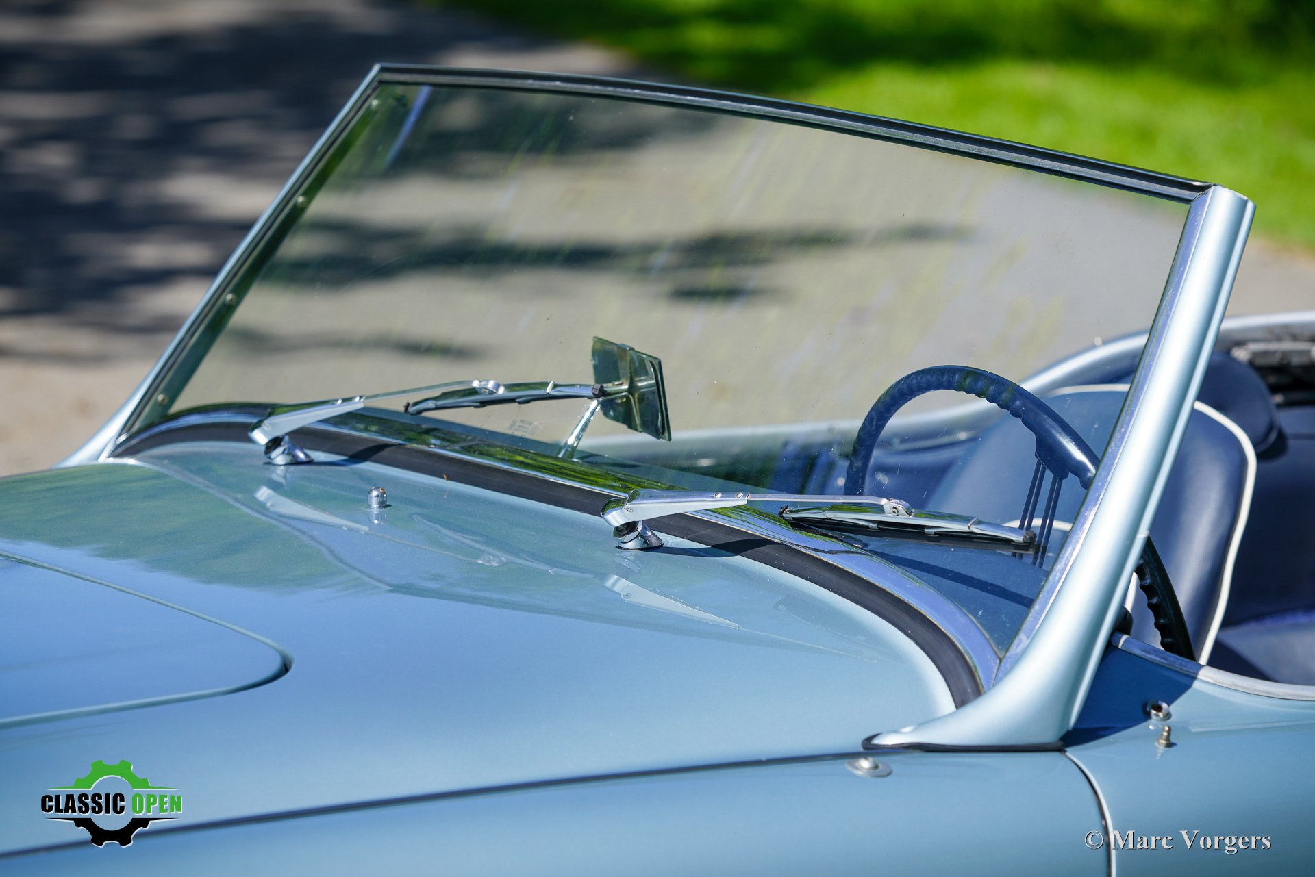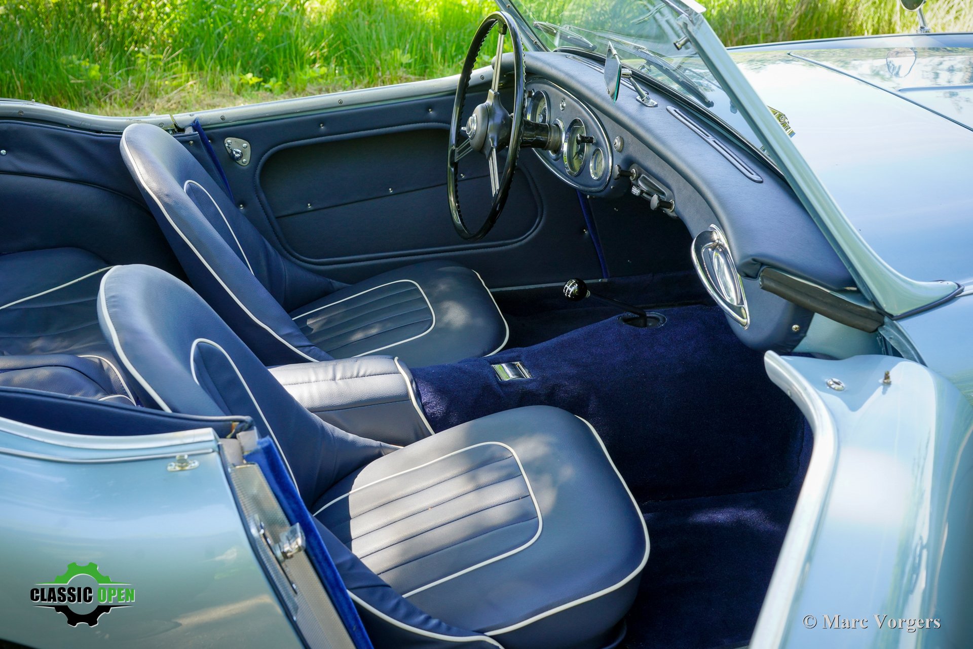 Exterior colour ice blue metallic combined with a dark blue leather interior trimmed with white piping and dark blue carpet. Black soft top and aluminium side-screens.