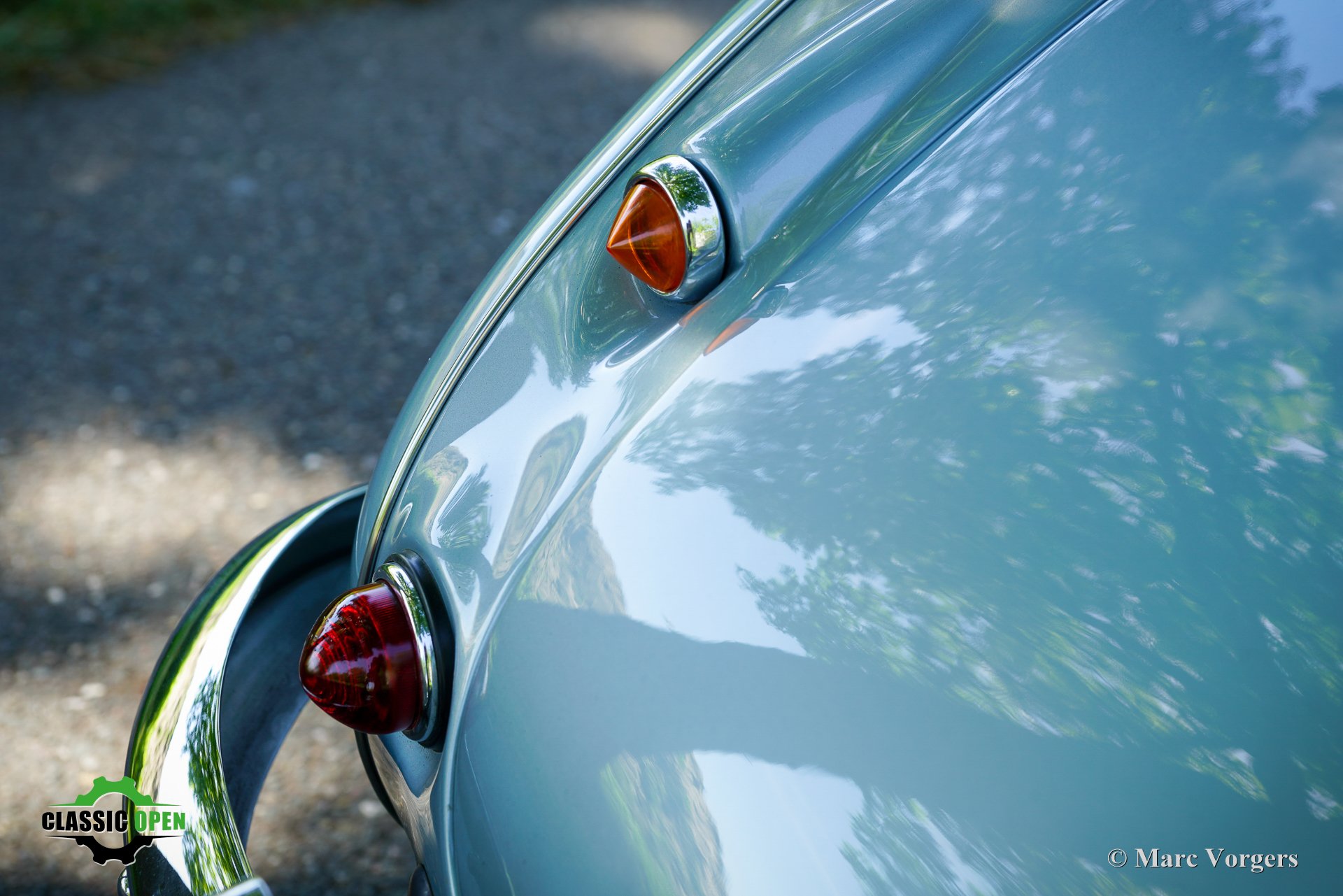 This is a gorgeous early Austin Healey 100/6 which can be identified by the unique ridge over the centre of the bonnet, and the pointed orange reflector covers at the rear.
