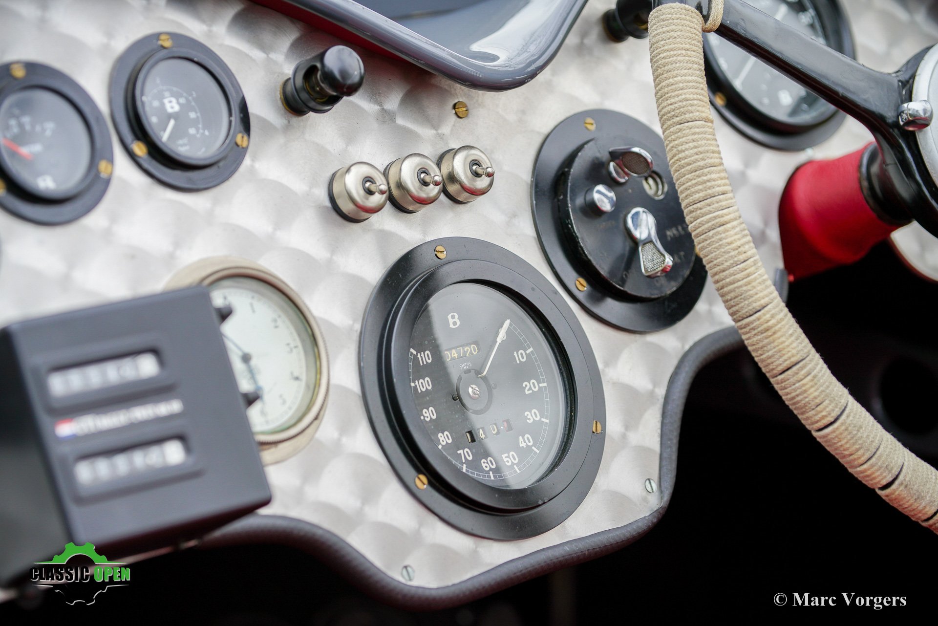 The aluminum dashboard features a beautiful set of gauges and switches.