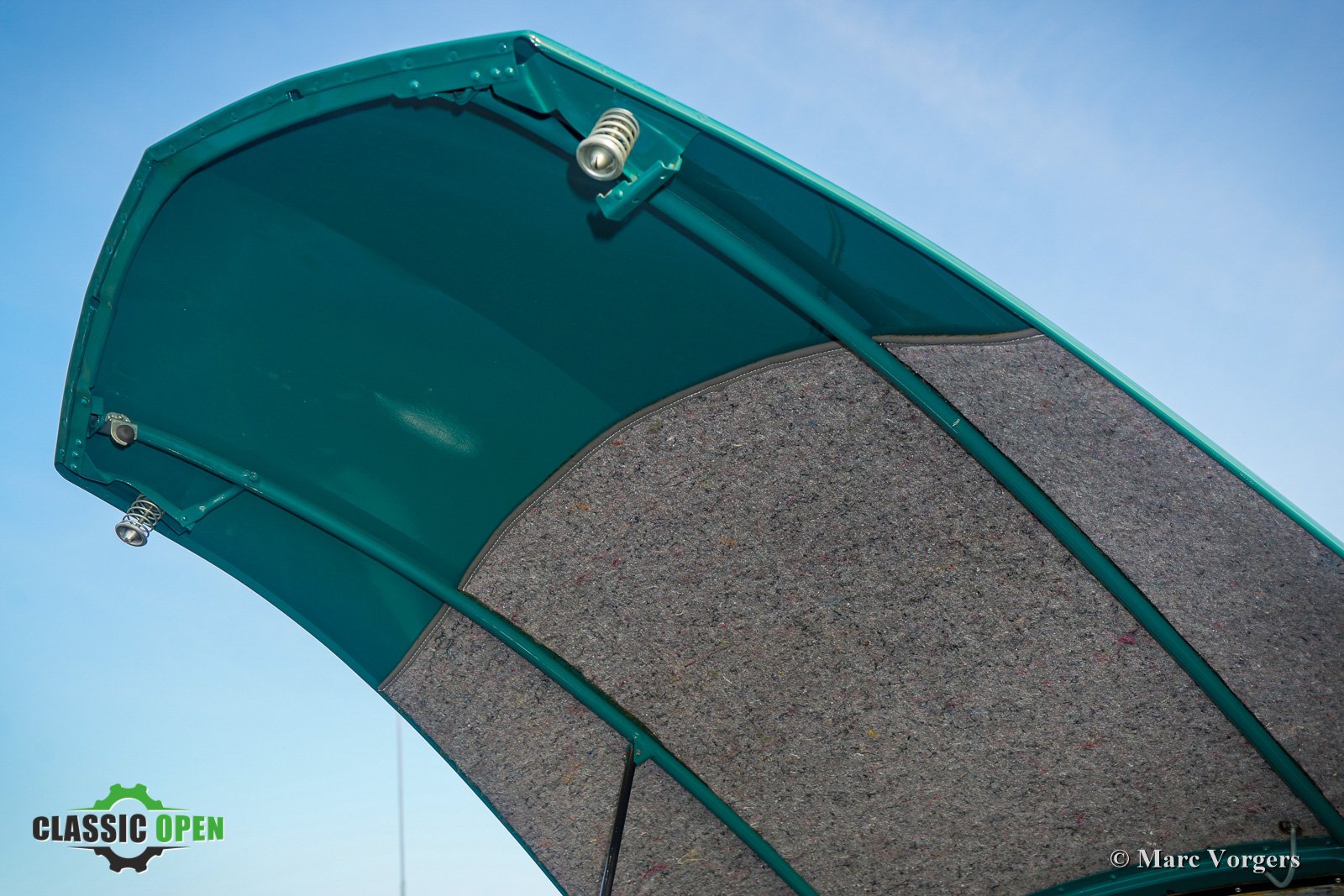 Colour green with a crème roof-top and a green / crème cloth interior.