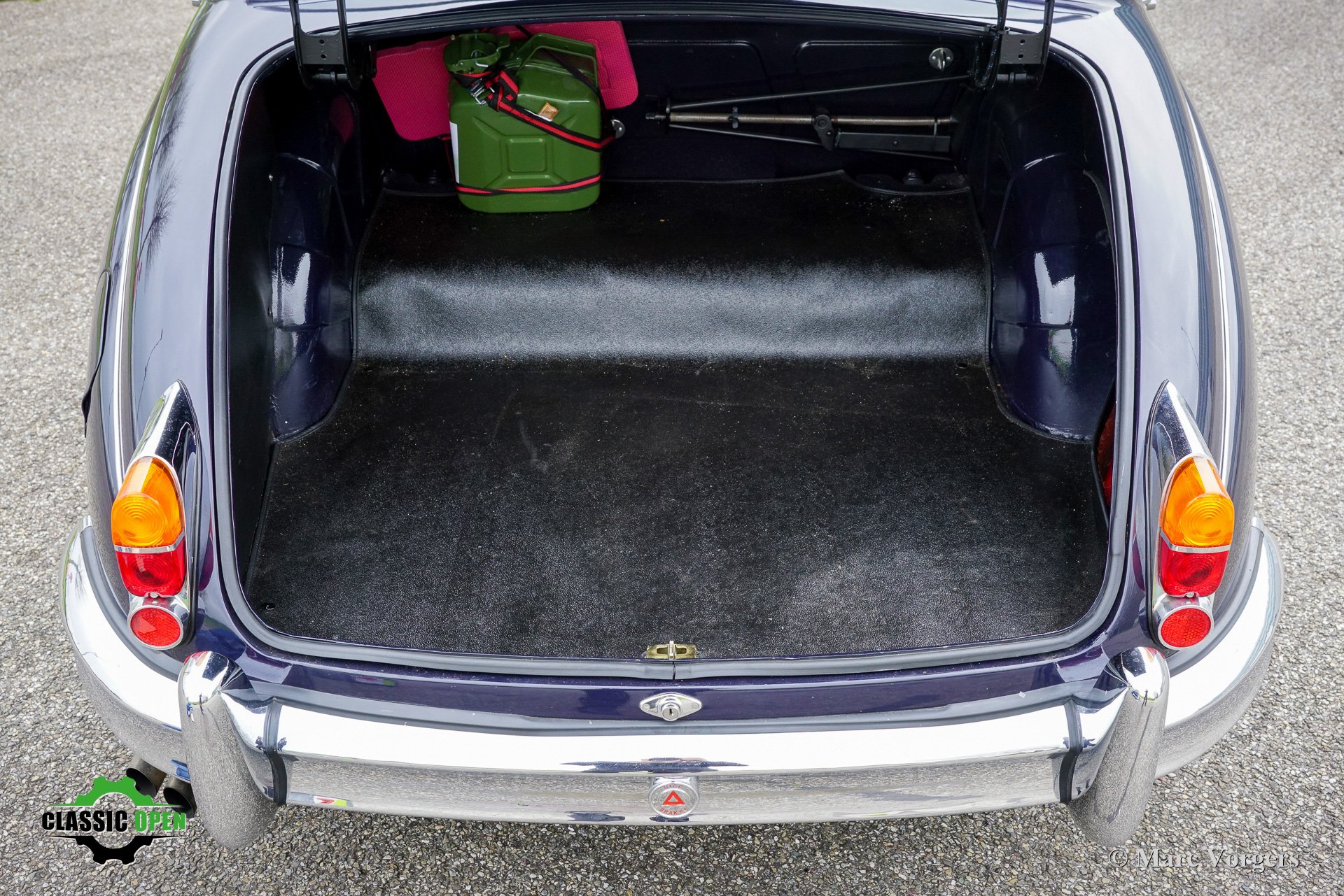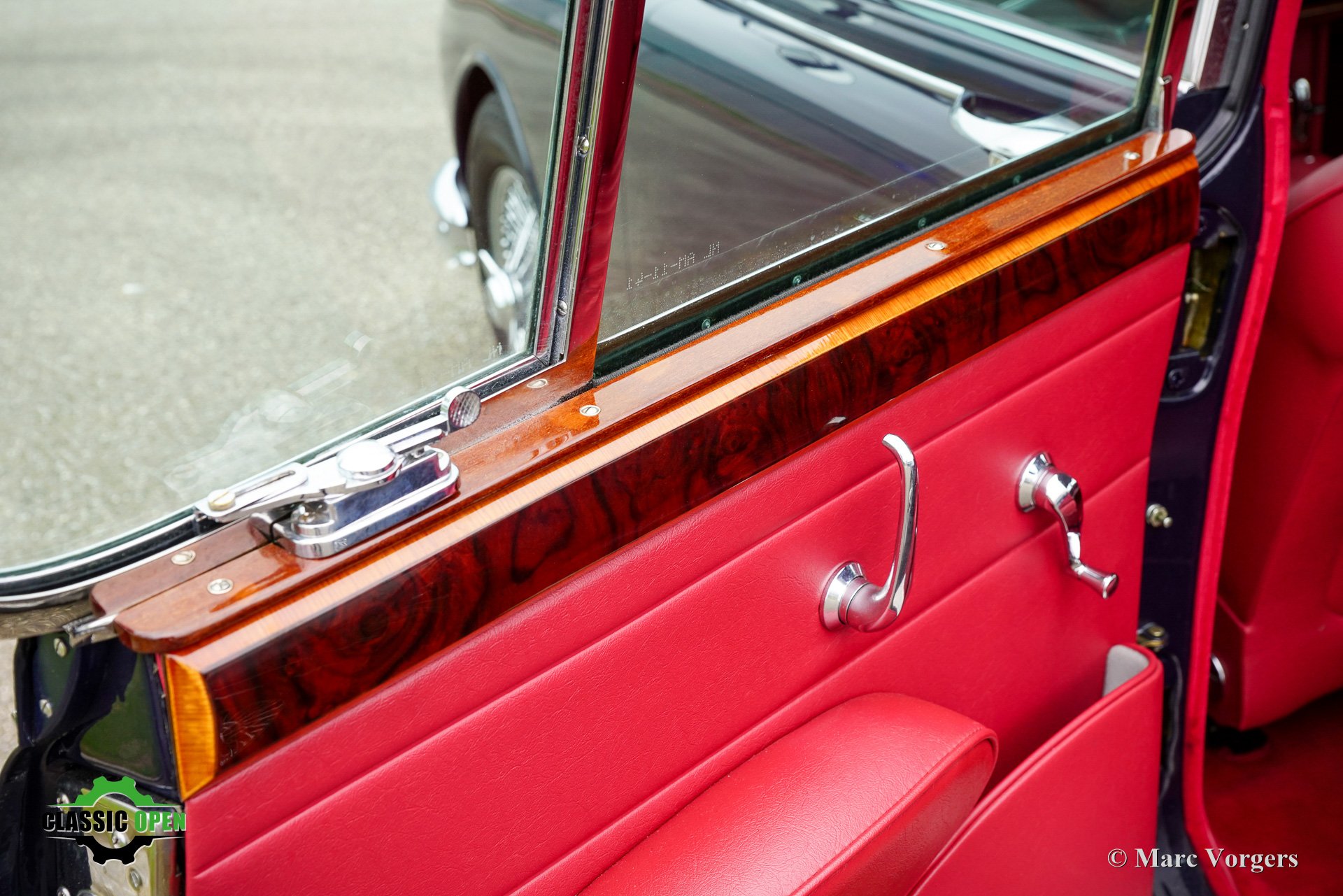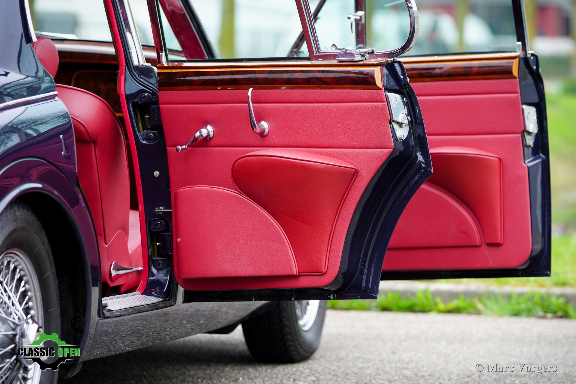 Exterior finished in dark blue, complemented by a red leather interior and red carpeting.