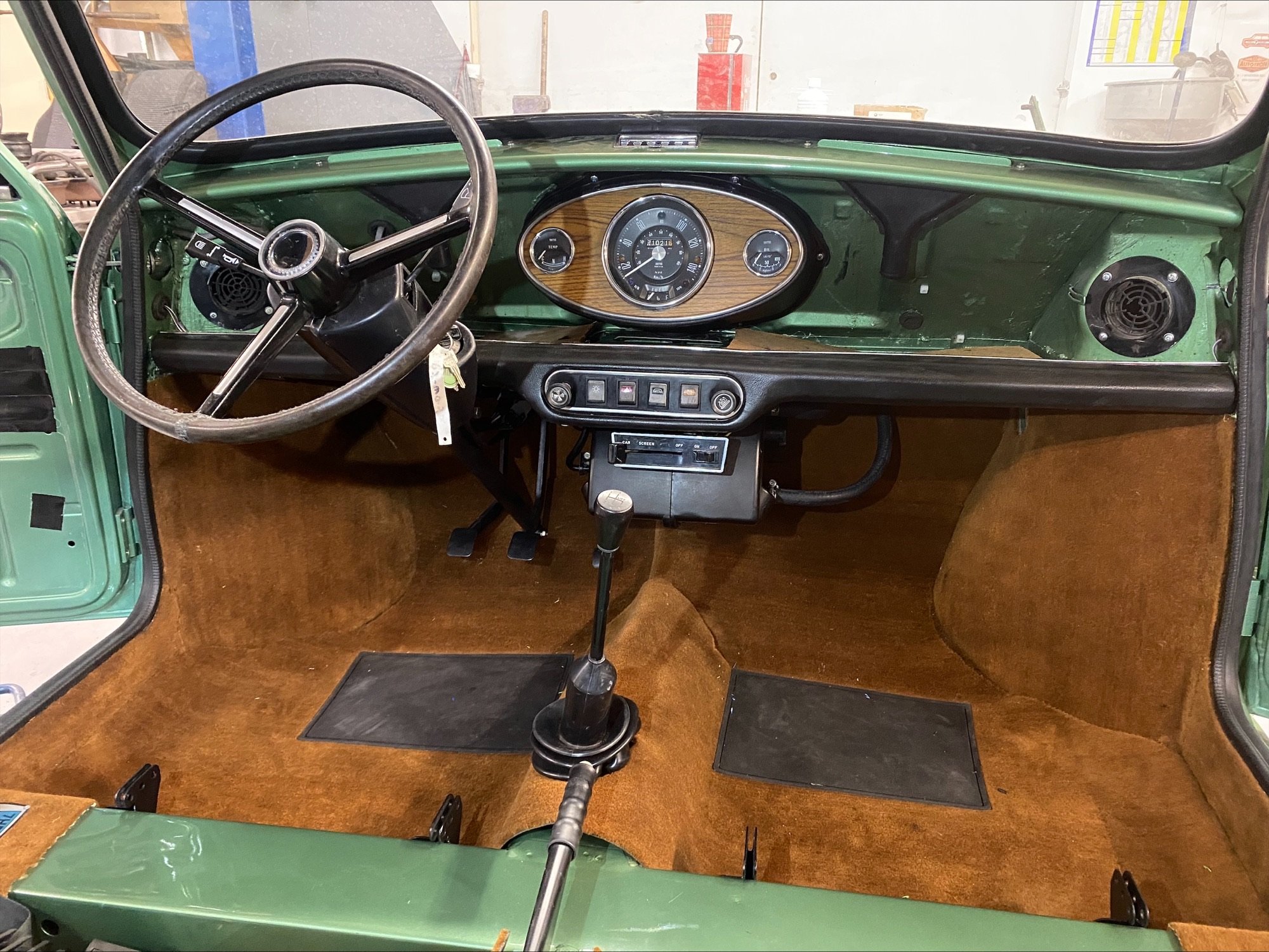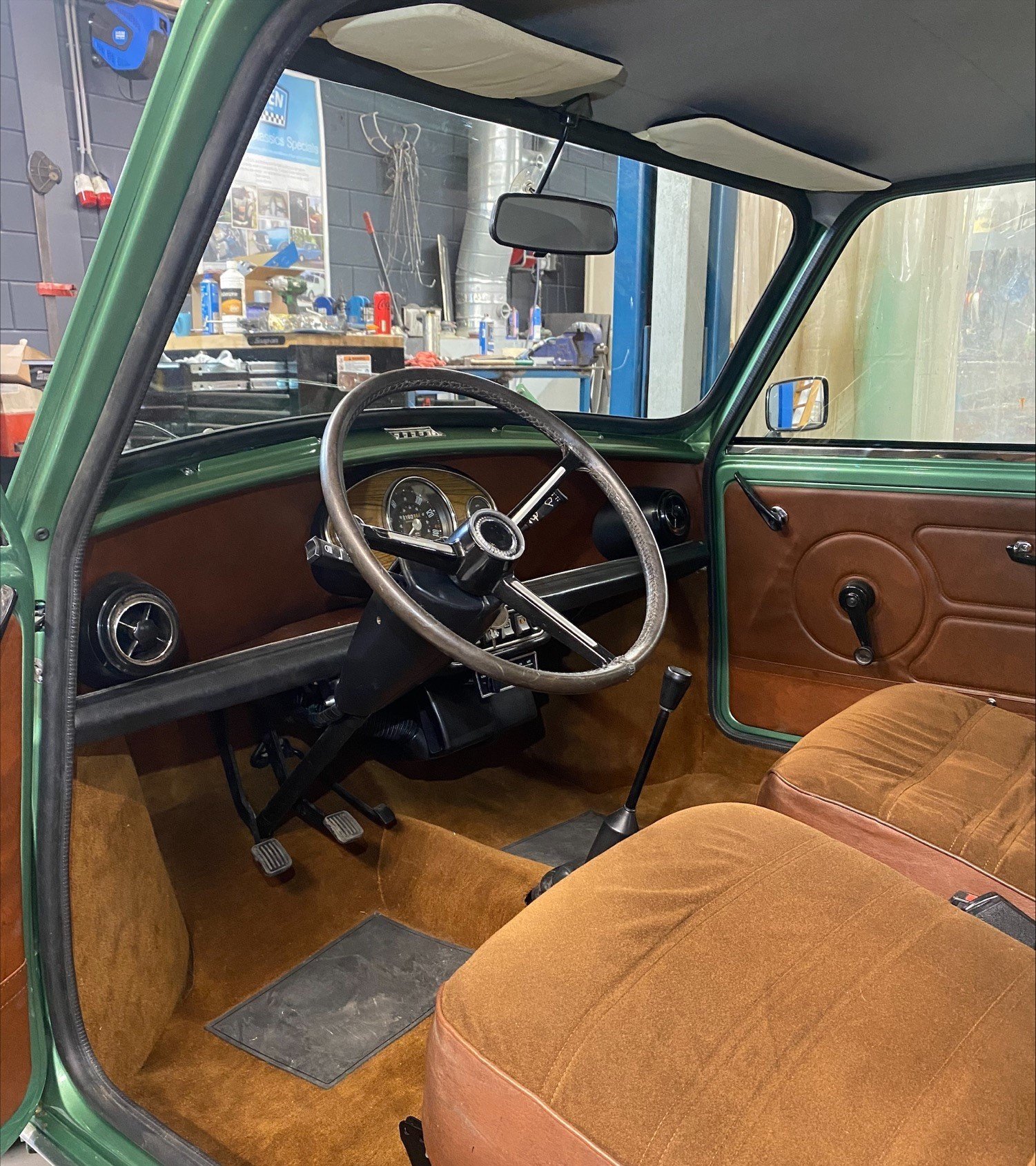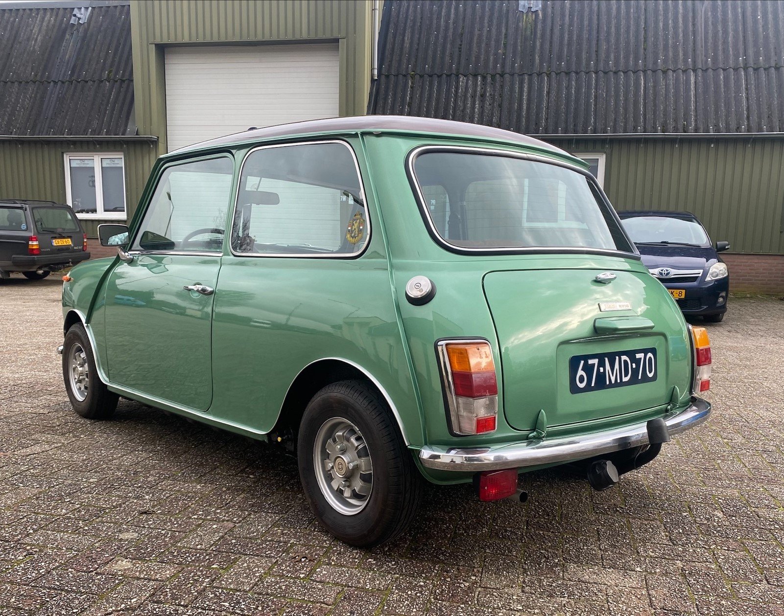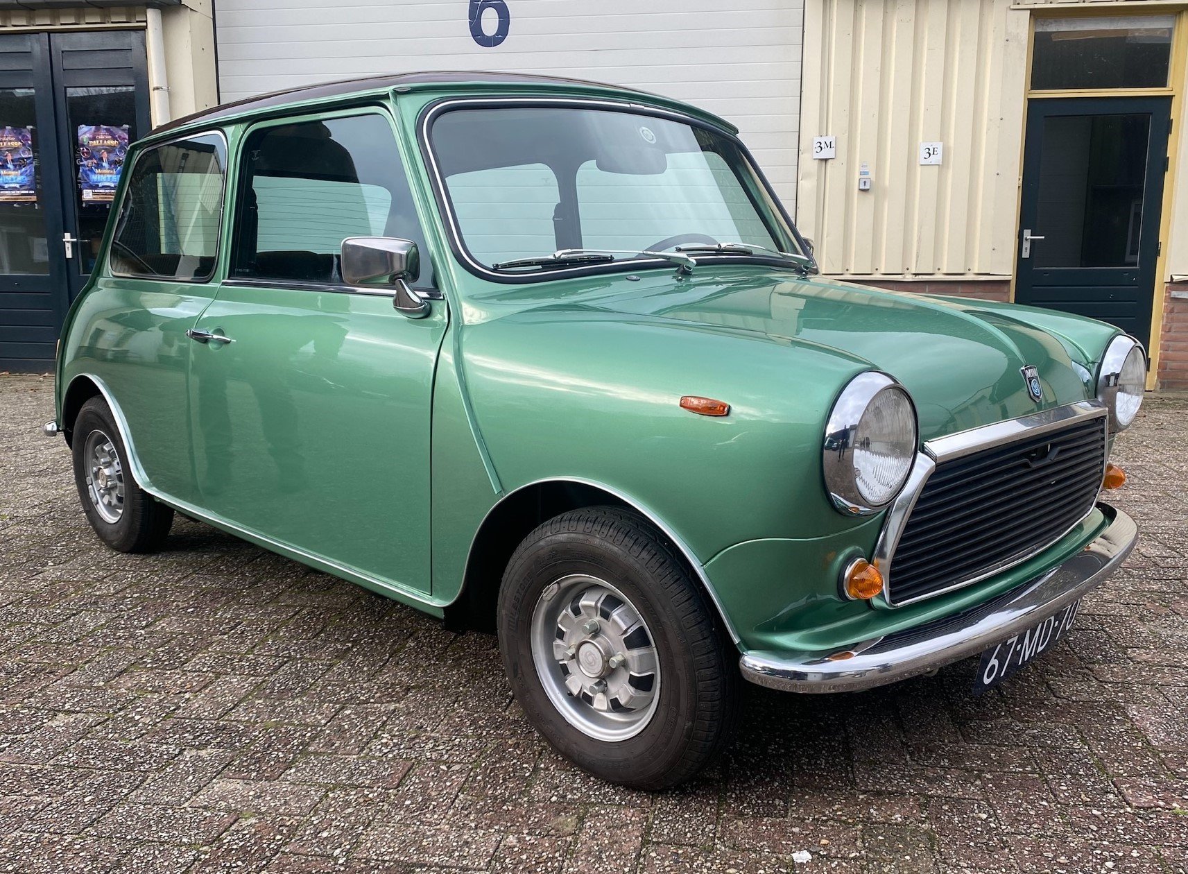 This light green Special 1100 was assembled in Belgium and fitted with a brown painted roof and a brown cloth interior there. Subsequently, this Mini was delivered new in the Netherlands.