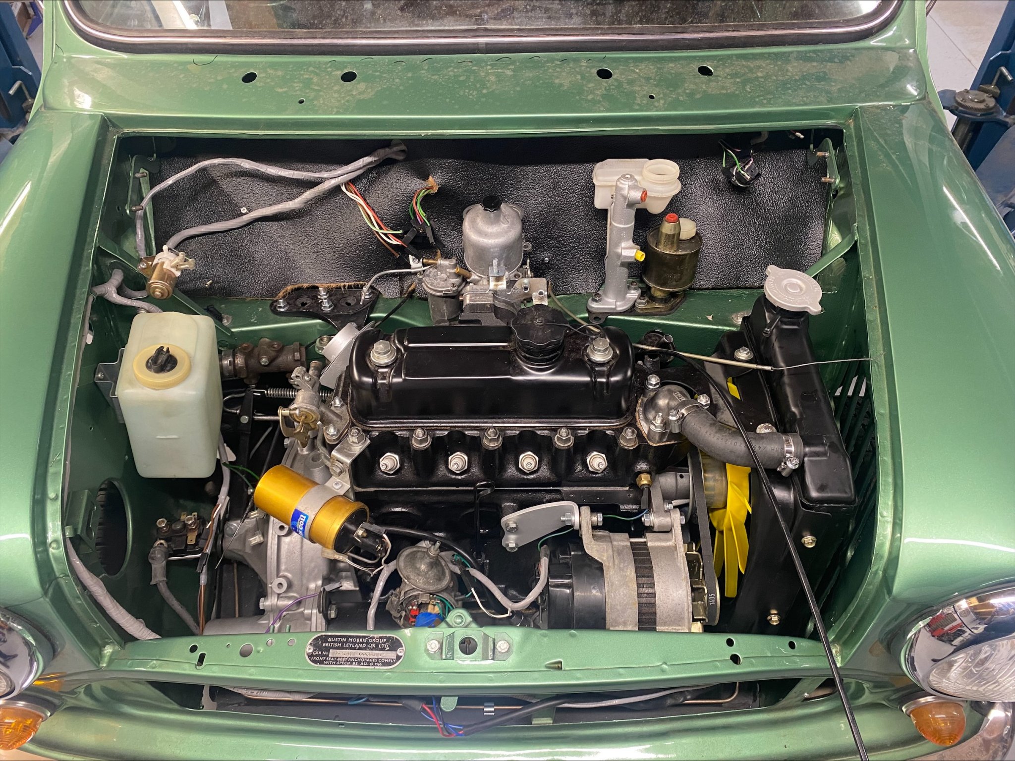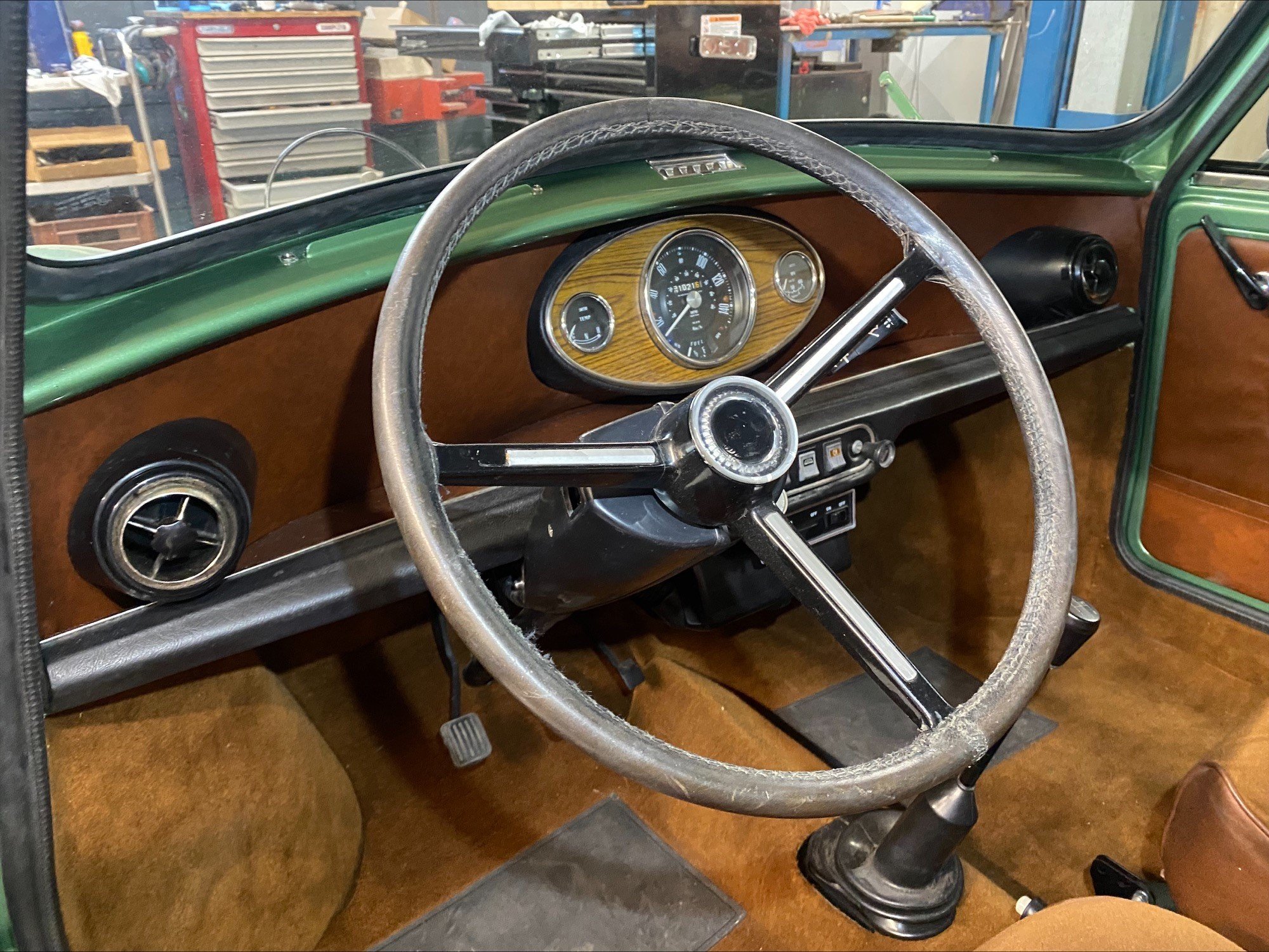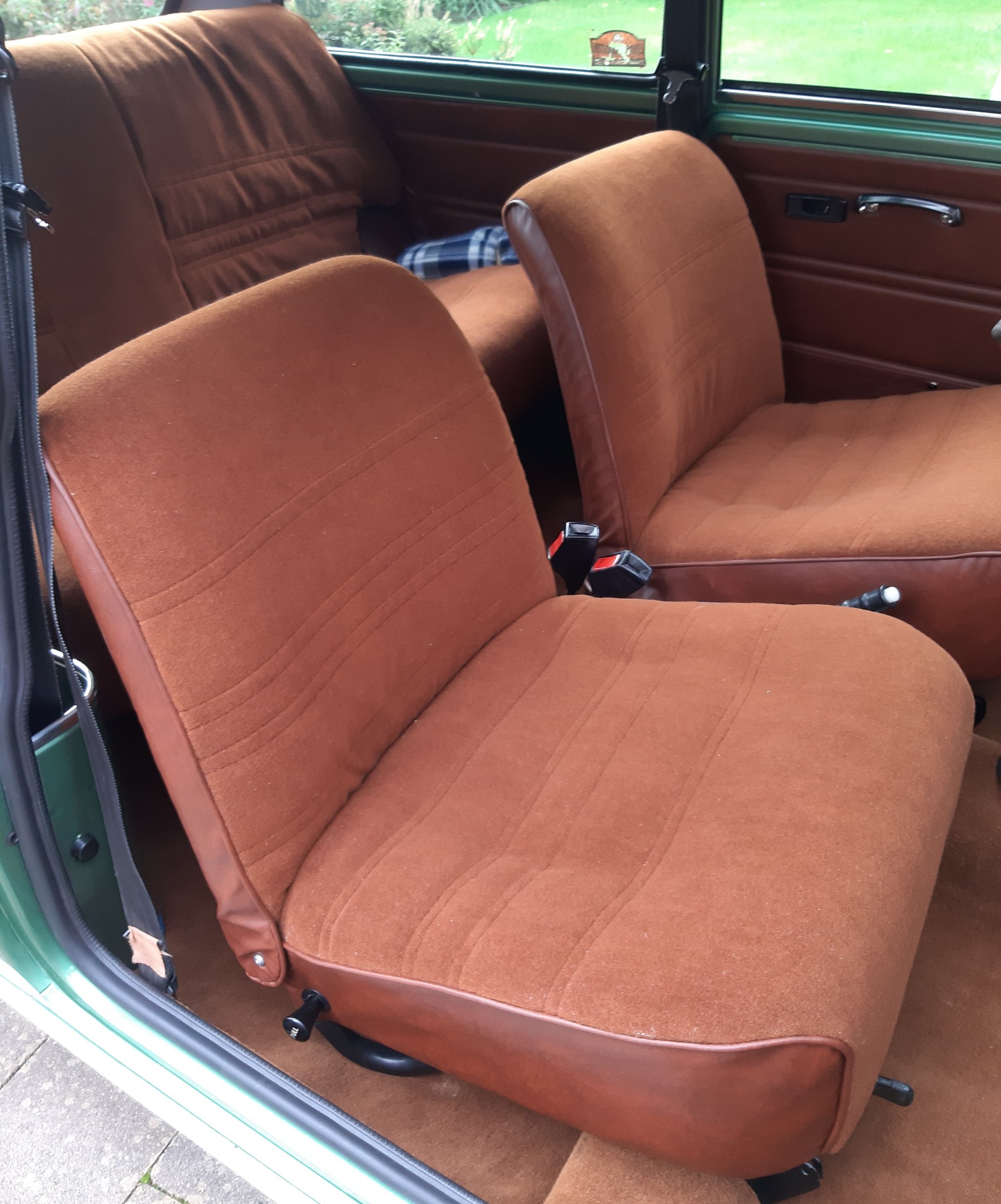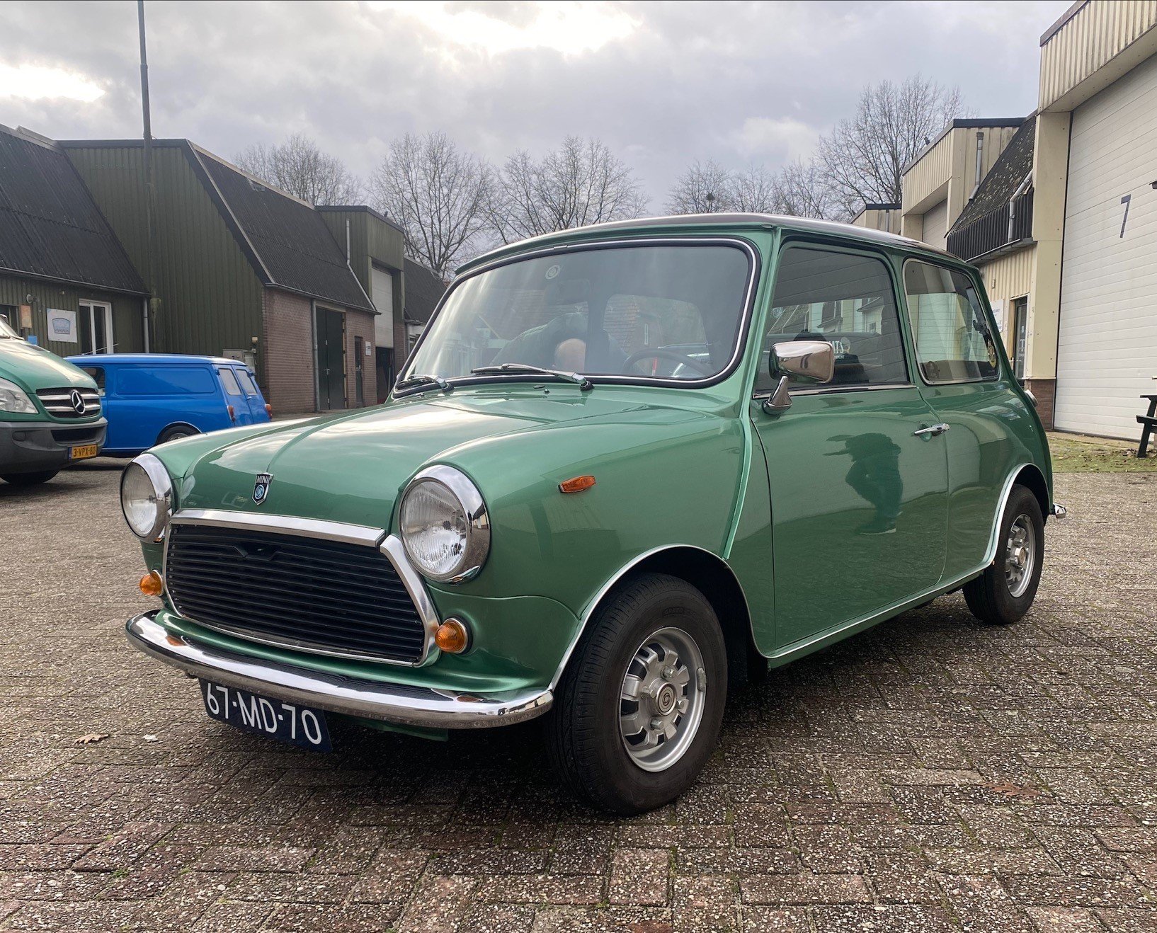 This light green Special 1100 was assembled in Belgium and fitted with a brown painted roof and a brown cloth interior there. Subsequently, this Mini was delivered new in the Netherlands.