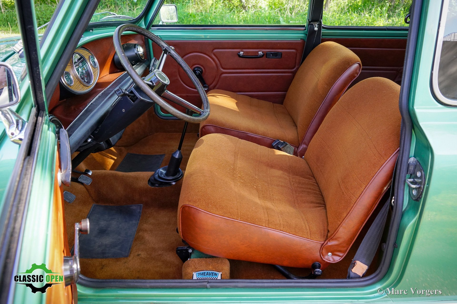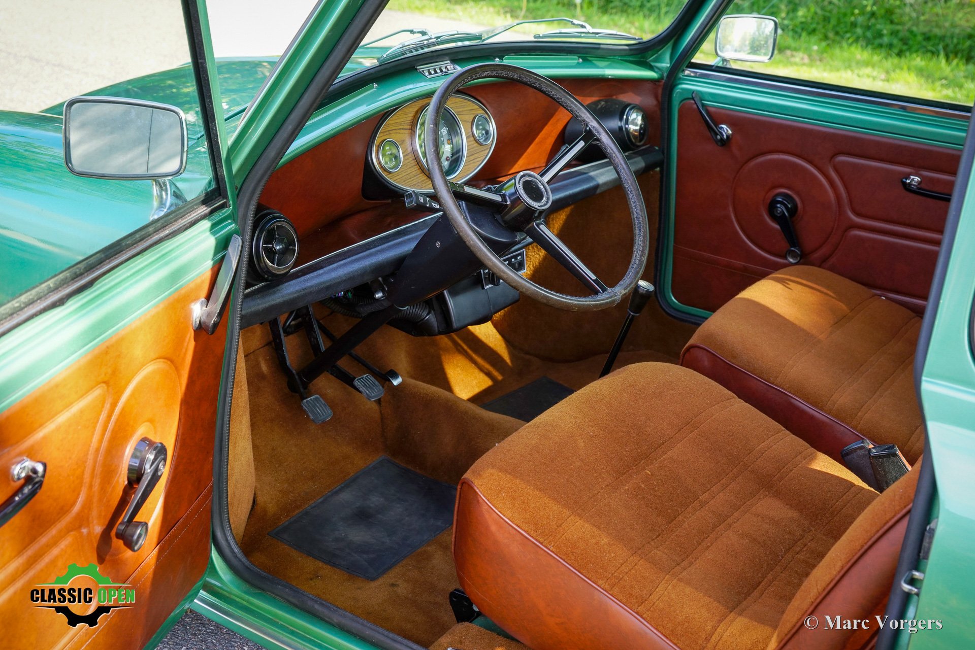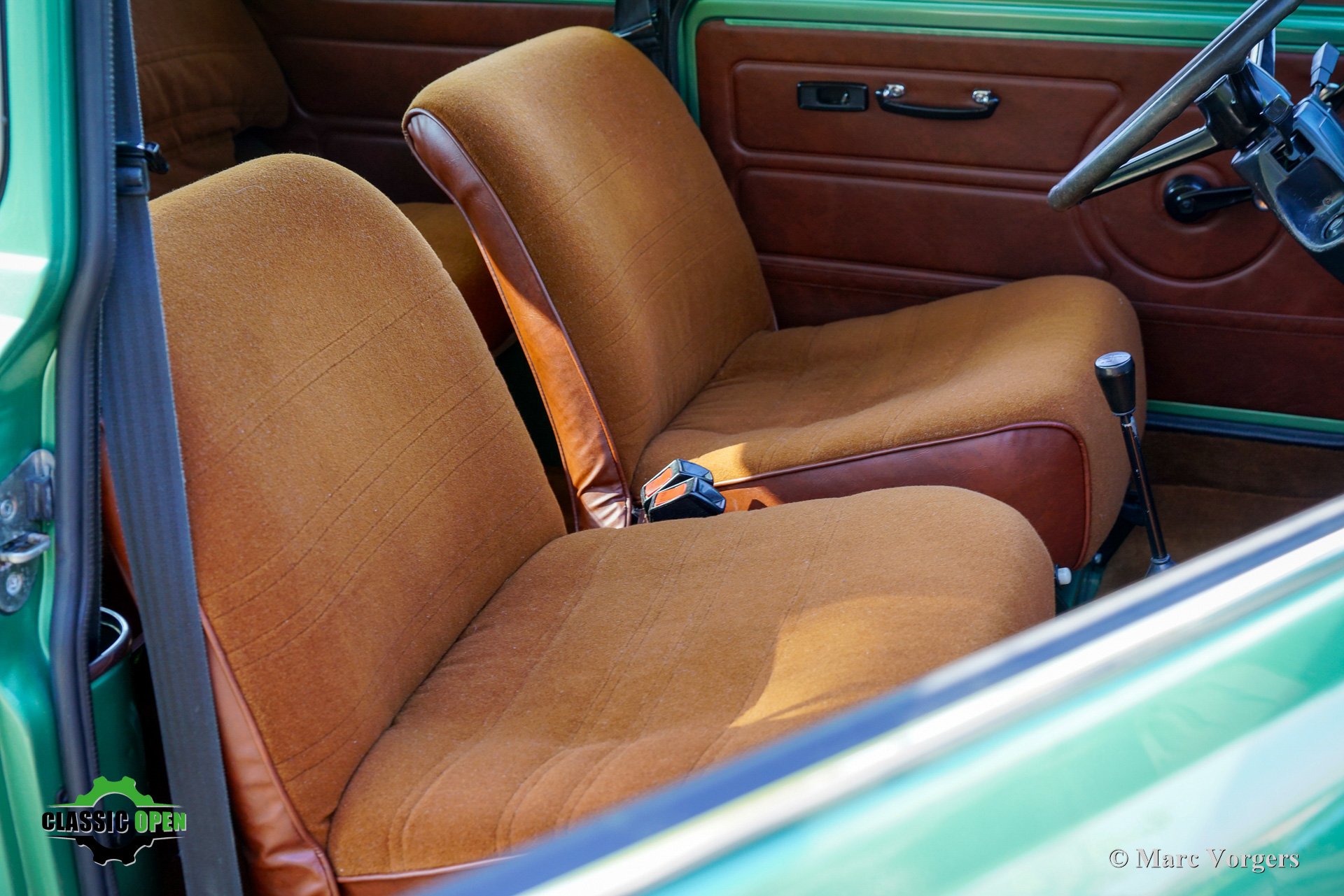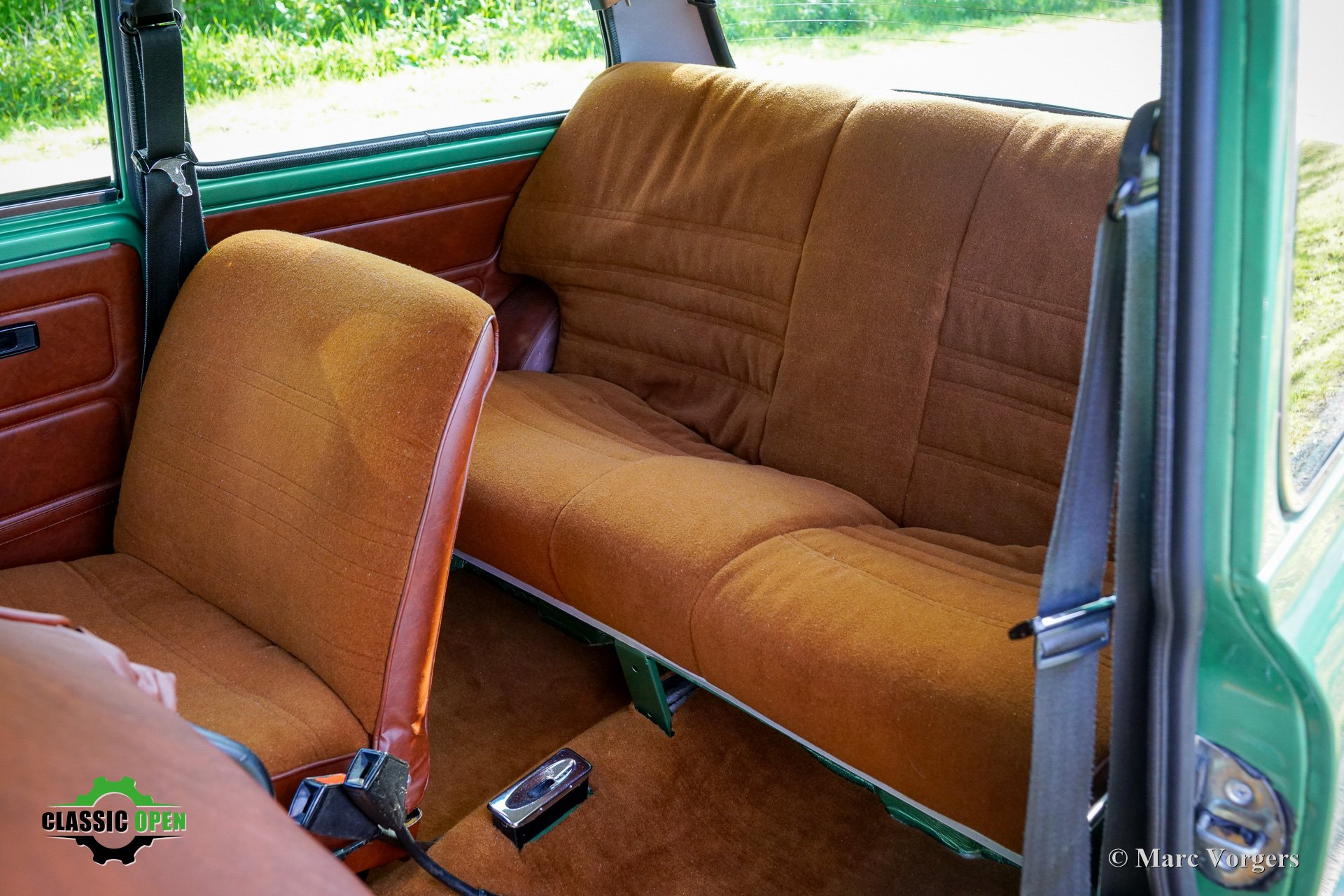 This wonderful Mini is painted green metallic with a brown metallic roof which is combined with a plush brown cloth interior. This light green Special 1100 was assembled in Belgium. Subsequently, the car was sold new in the in the Netherlands.