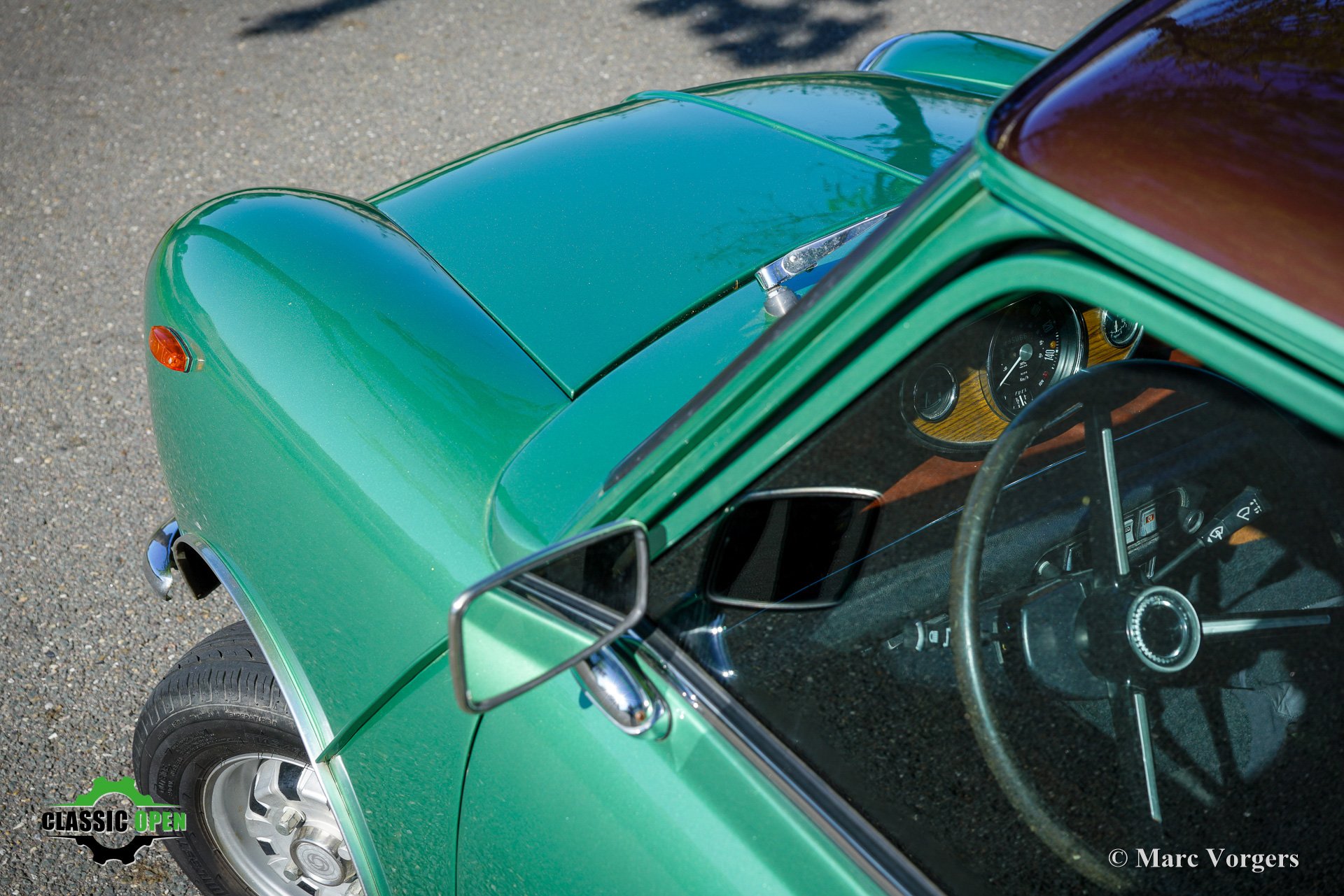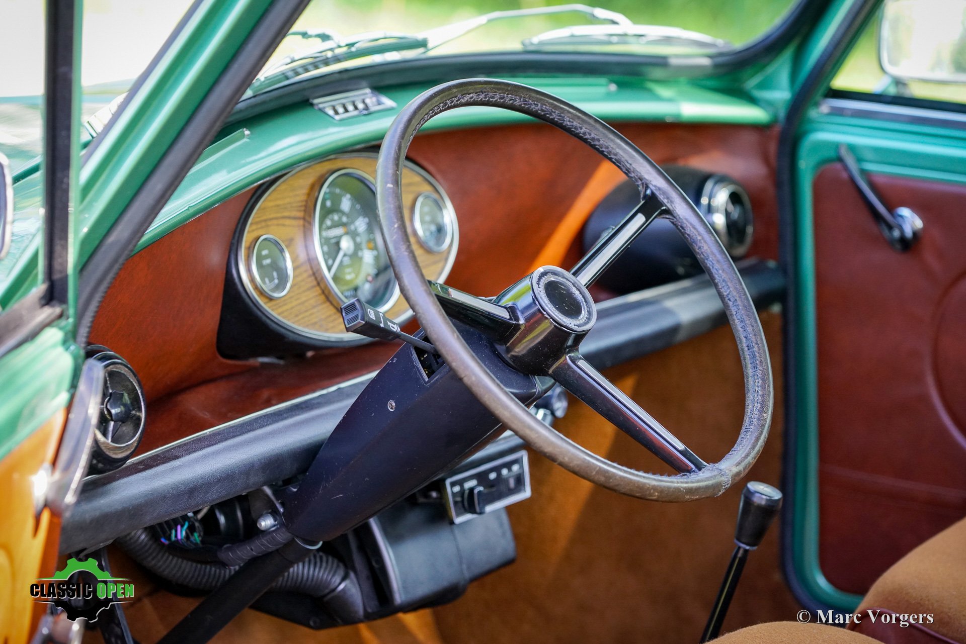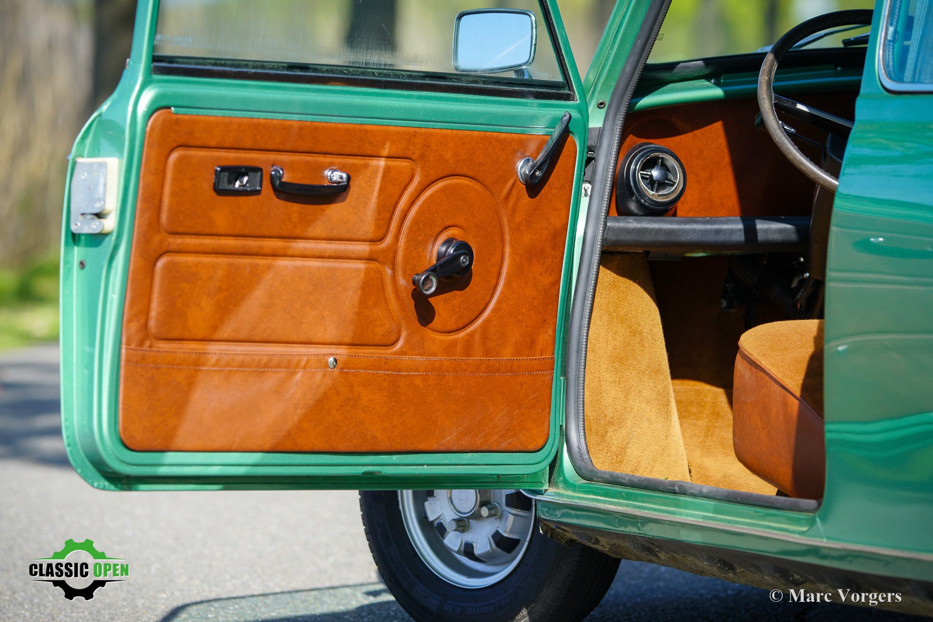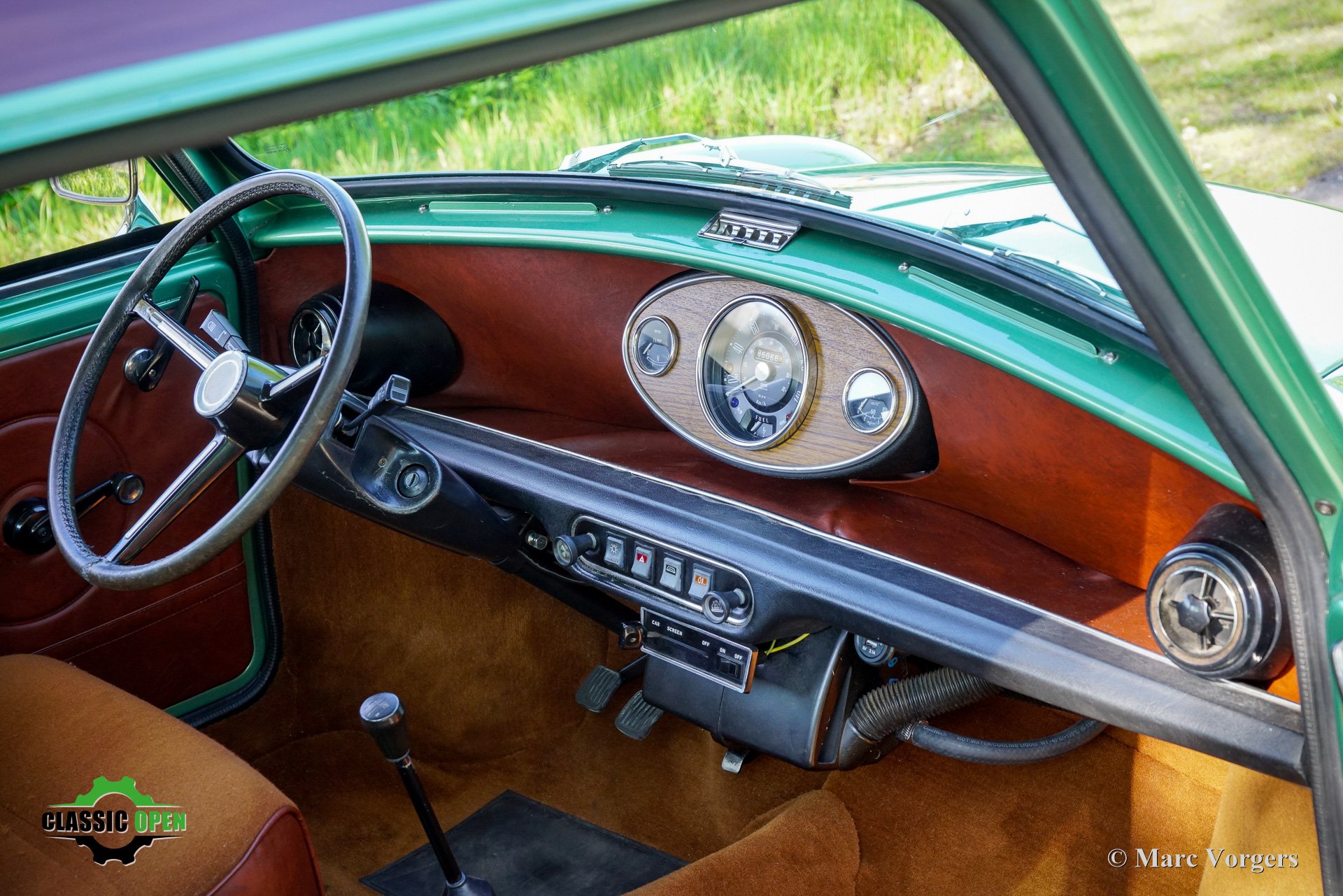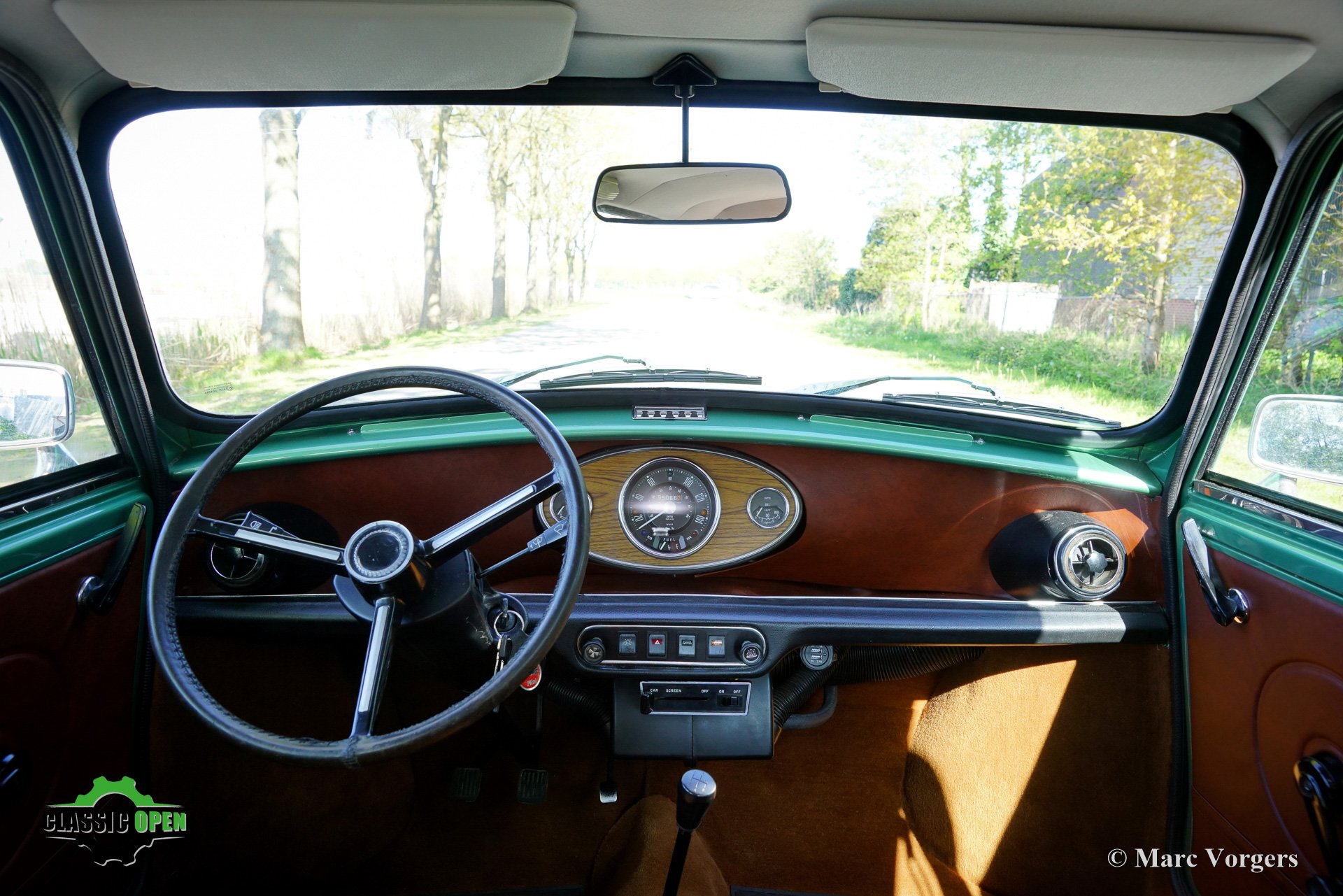 This wonderful Mini is painted green metallic with a brown metallic roof which is combined with a plush brown cloth interior. This light green Special 1100 was assembled in Belgium. Subsequently, the car was sold new in the in the Netherlands.